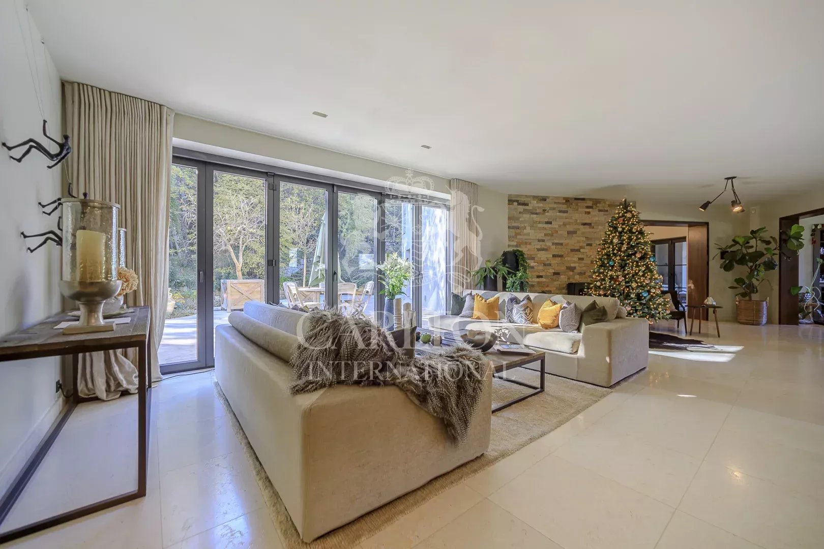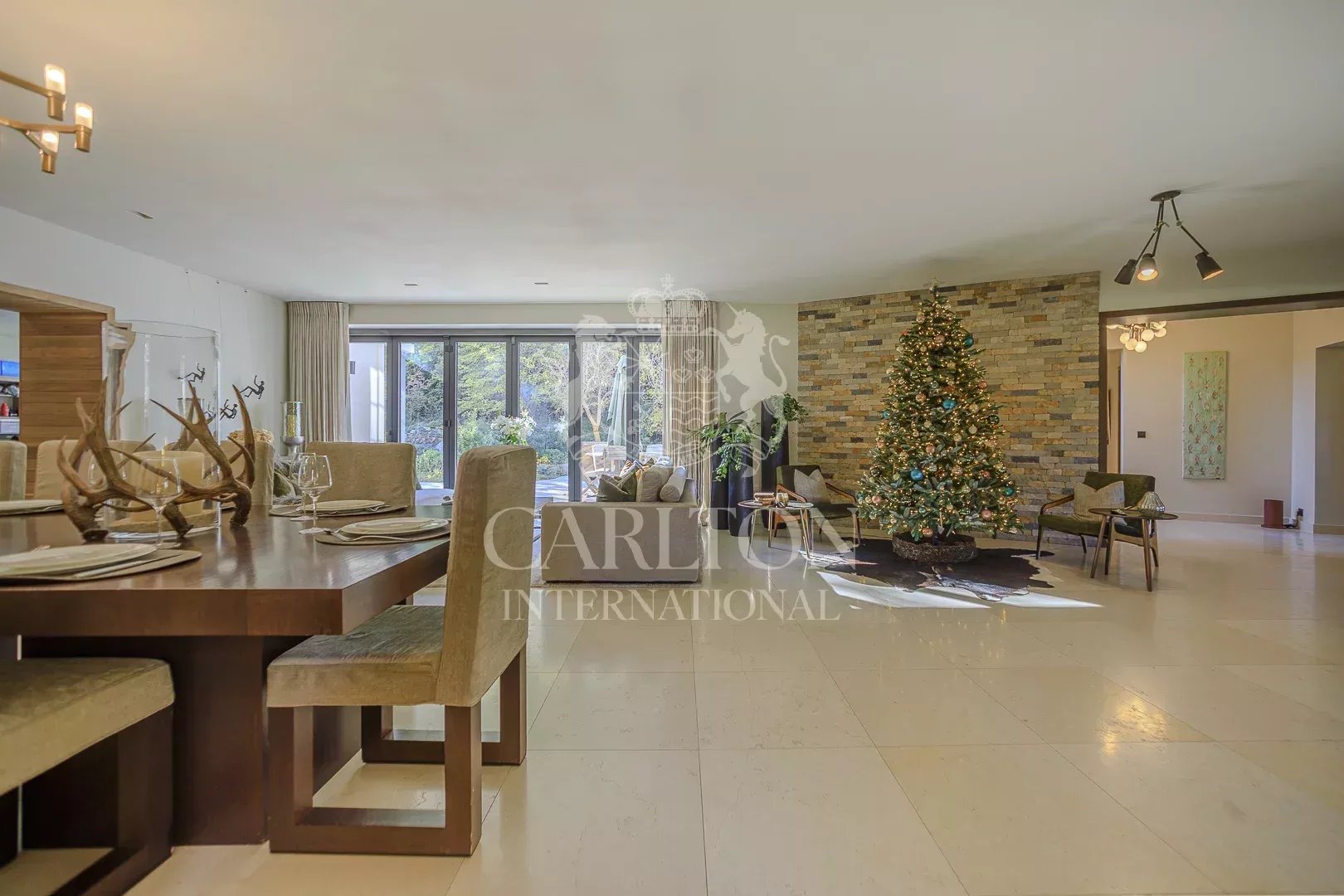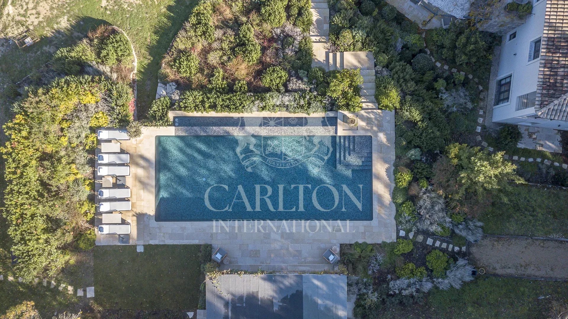 La amplia cocina se abre a una terraza resguardada por una pérgola y utilizada como salón y comedor de verano. Esta sublime villa ha sido renovada con materiales de calidad y decorada con un estilo elegante y depurado.