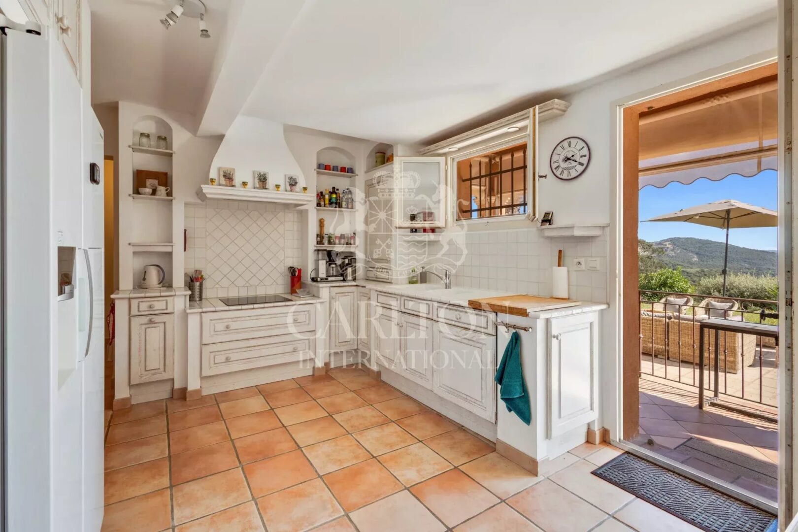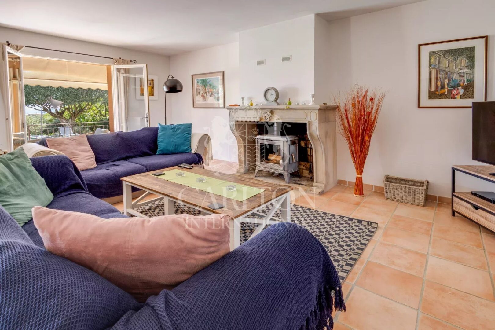 The fully equipped open kitchen flows seamlessly into the spacious living room, a warm and inviting space enhanced by a wood-burning fireplace with insert and French doors opening directly onto the terrace. Additional amenities include a pantry, a laundry room, and ample storage.