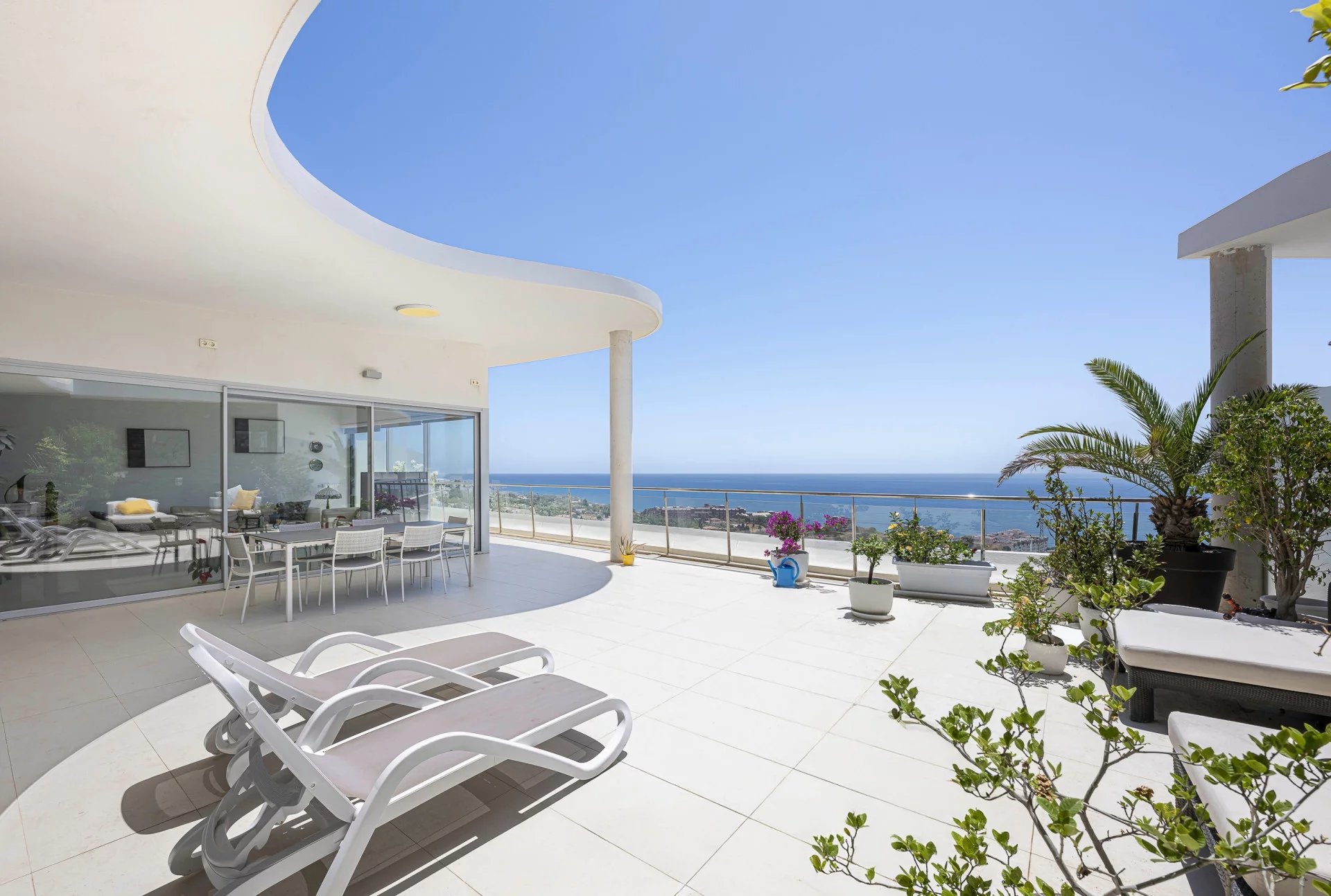 Una terraza privada de 97 m² con vistas panorámicas al Mediterráneo, ideal para cenar al aire libre, descansar o disfrutar de un cóctel al atardecer.