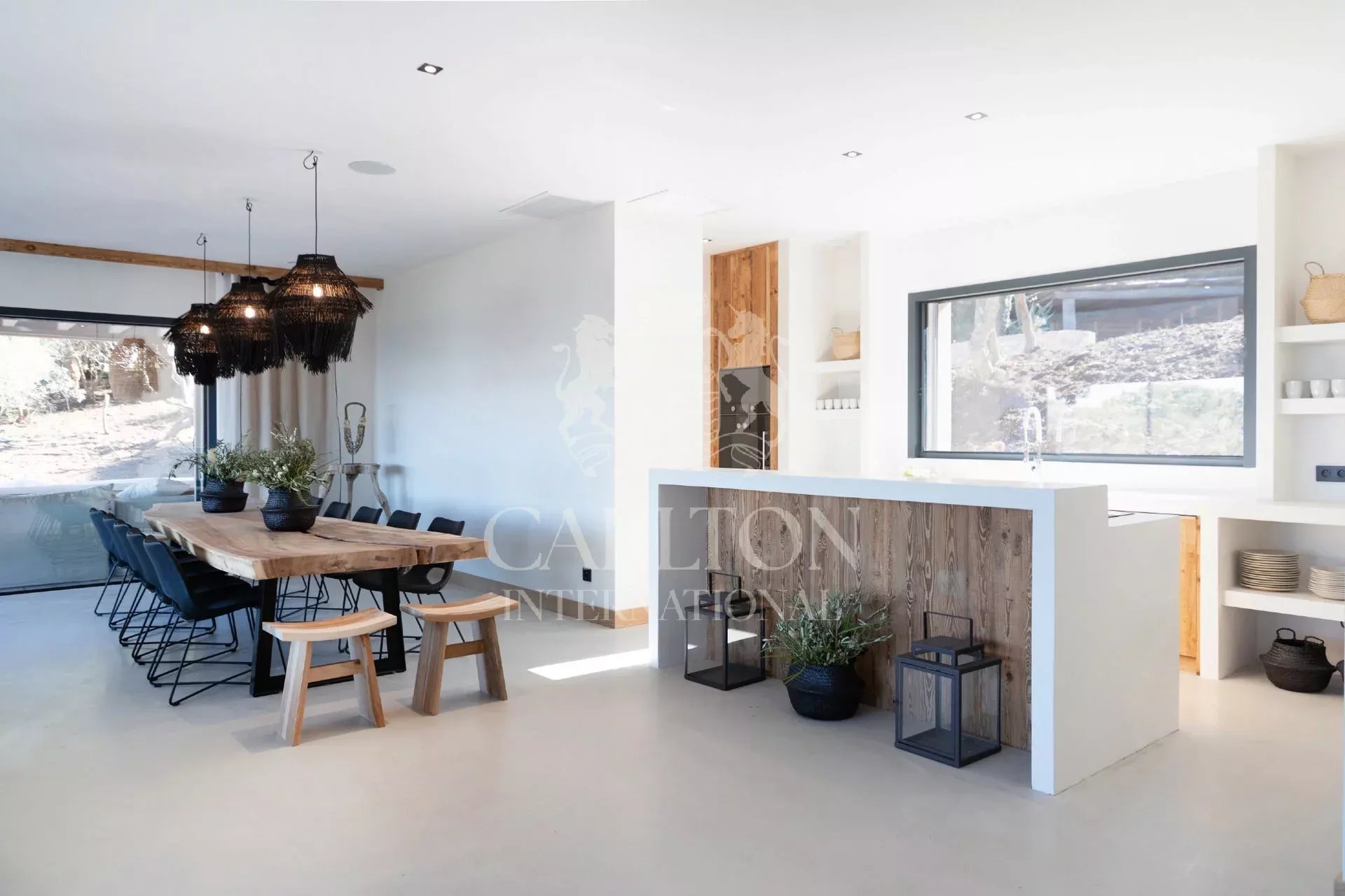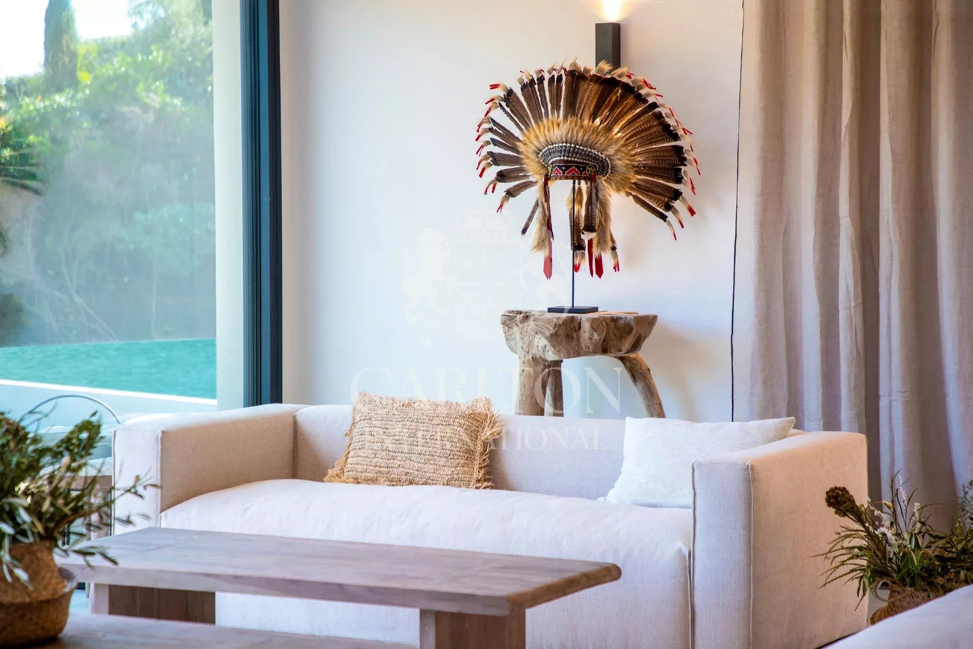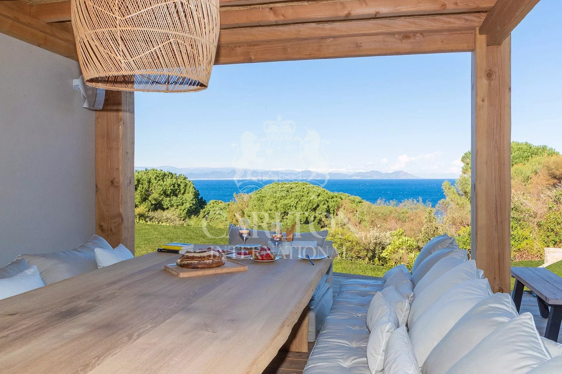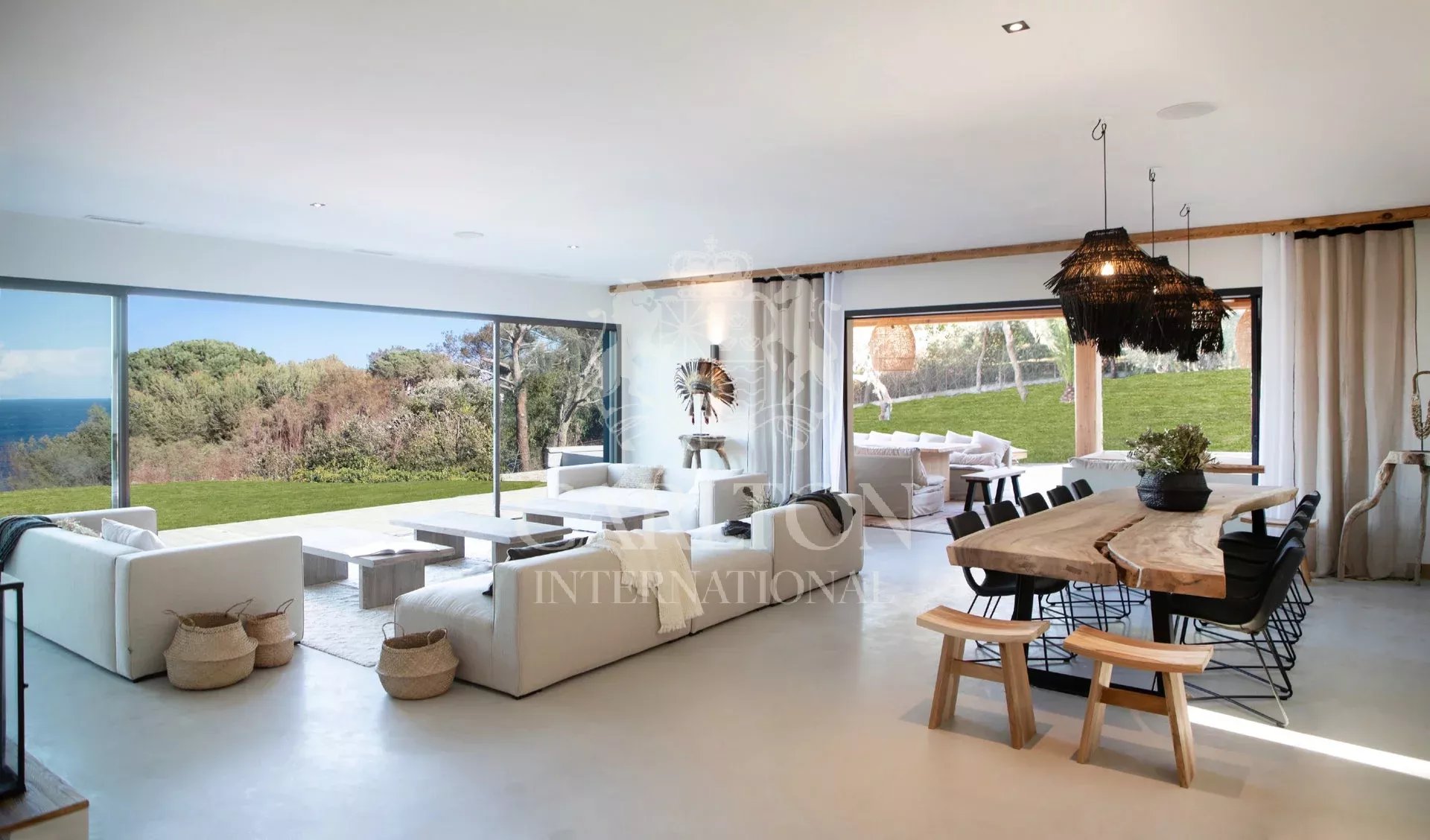 On 3 levels, the 520 m2 house offers 7 guest bedrooms (including 2 masters) and 2 staff bedrooms. In a refined and warm decoration, the living rooms create harmony for your comfort and open onto the terrace and the garden with sea view.