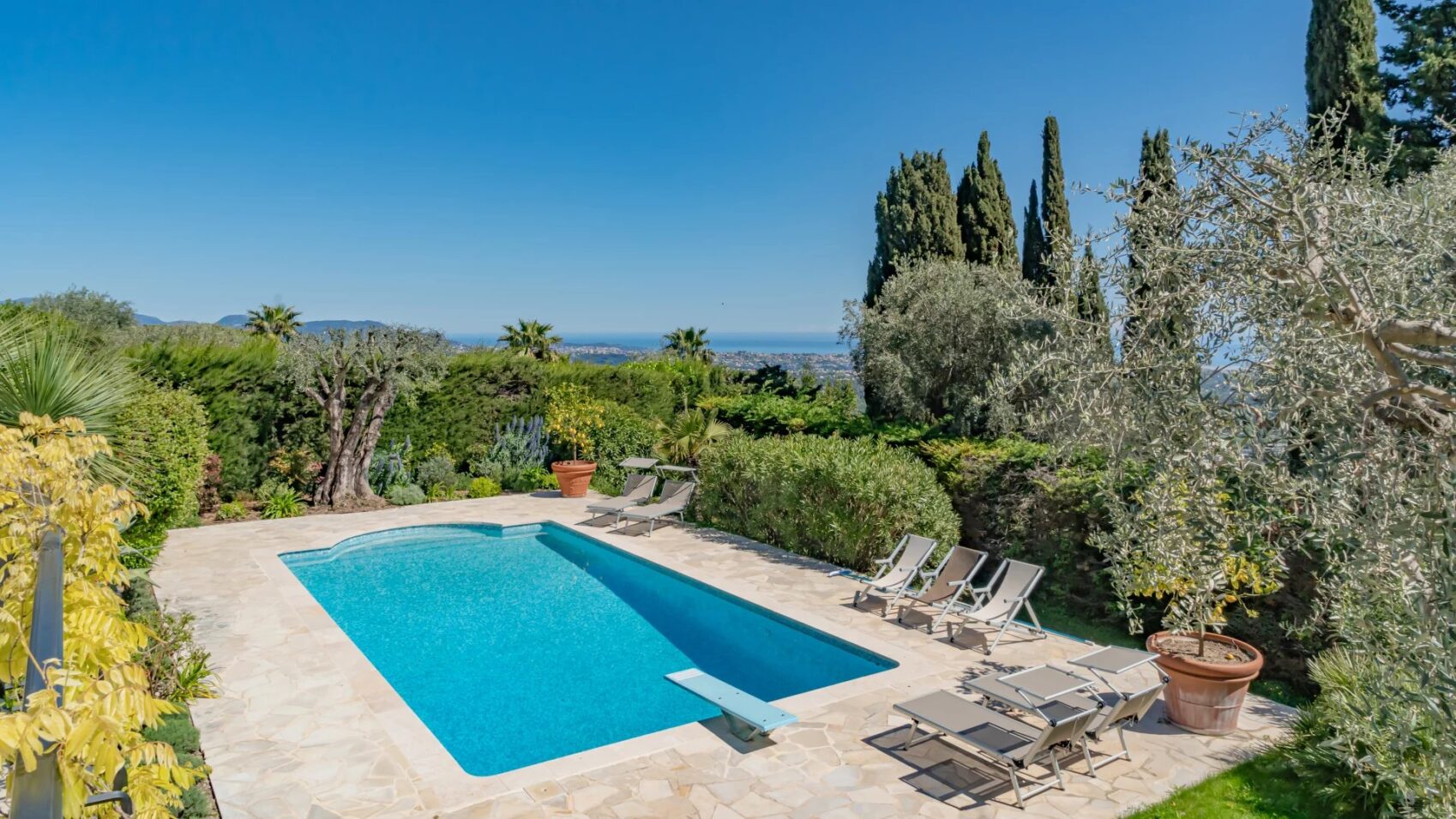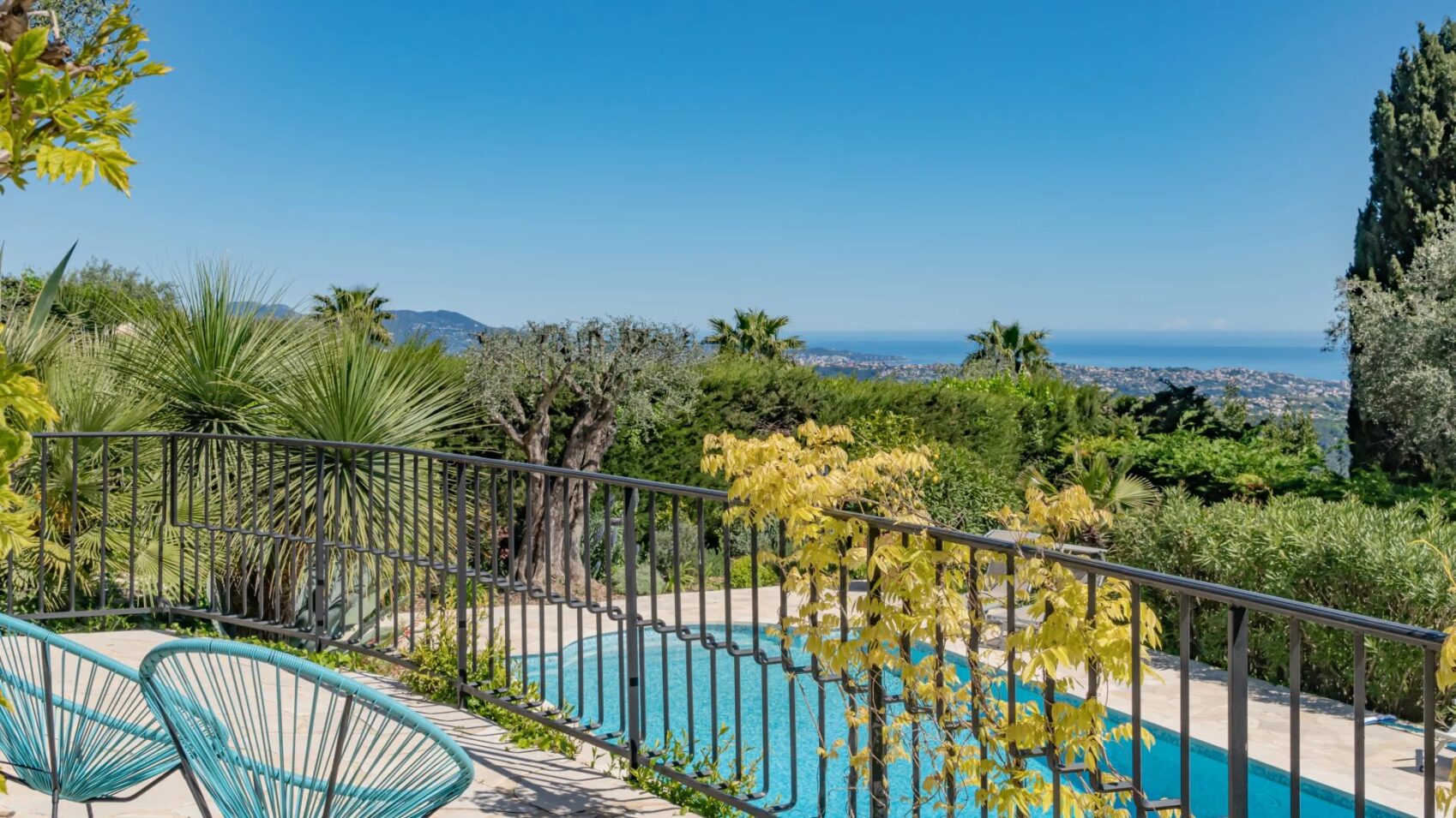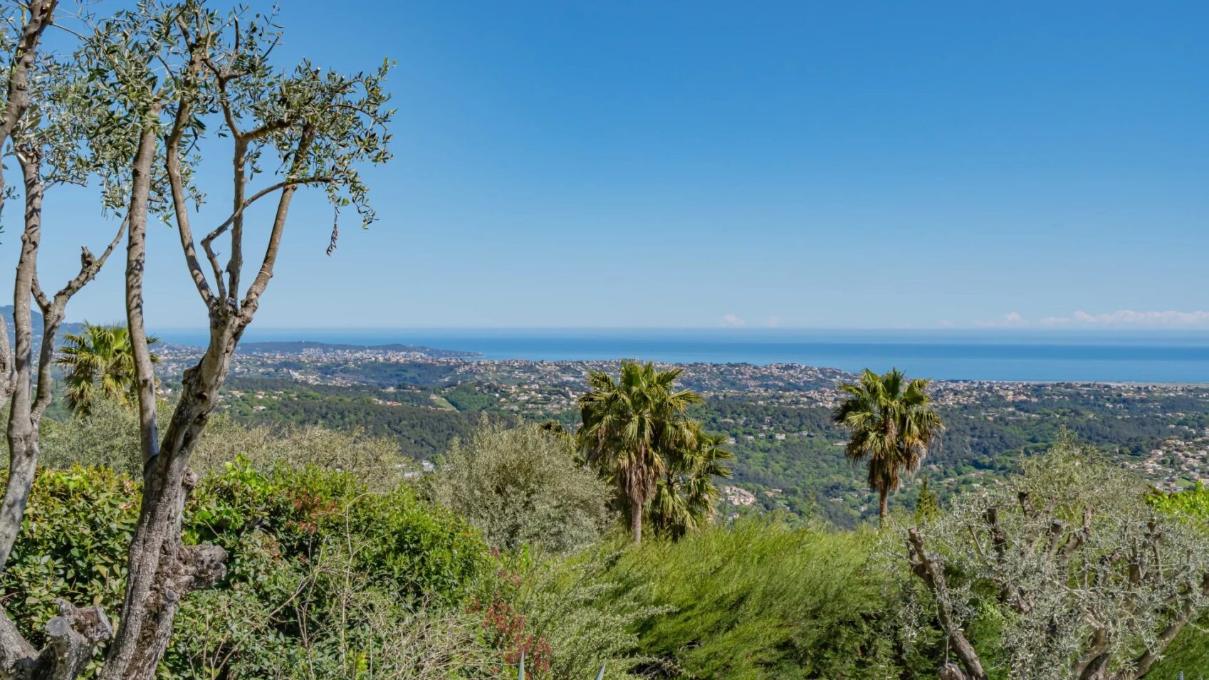 Perched in the hills above Vence, this exceptional property offers a breathtaking panoramic view of the Mediterranean, stretching from Cap Ferrat to Cap d’Antibes.