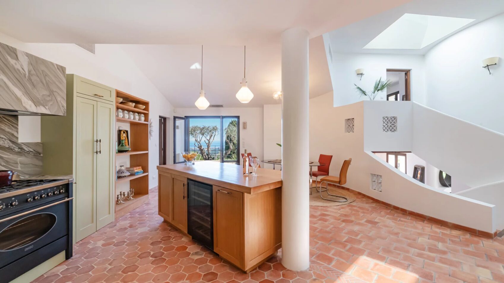 The house is also available fully furnished. The kitchen, crafted by renowned artisans, is custom-designed with raw wood and quartzite elements.