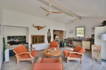 Magnificent landscaped park of 6,920 m² with swimming pool, pool house with summer kitchen, pétanque court, golf area, beautiful terraces, double garage, carport for 6 cars and plenty of parking.