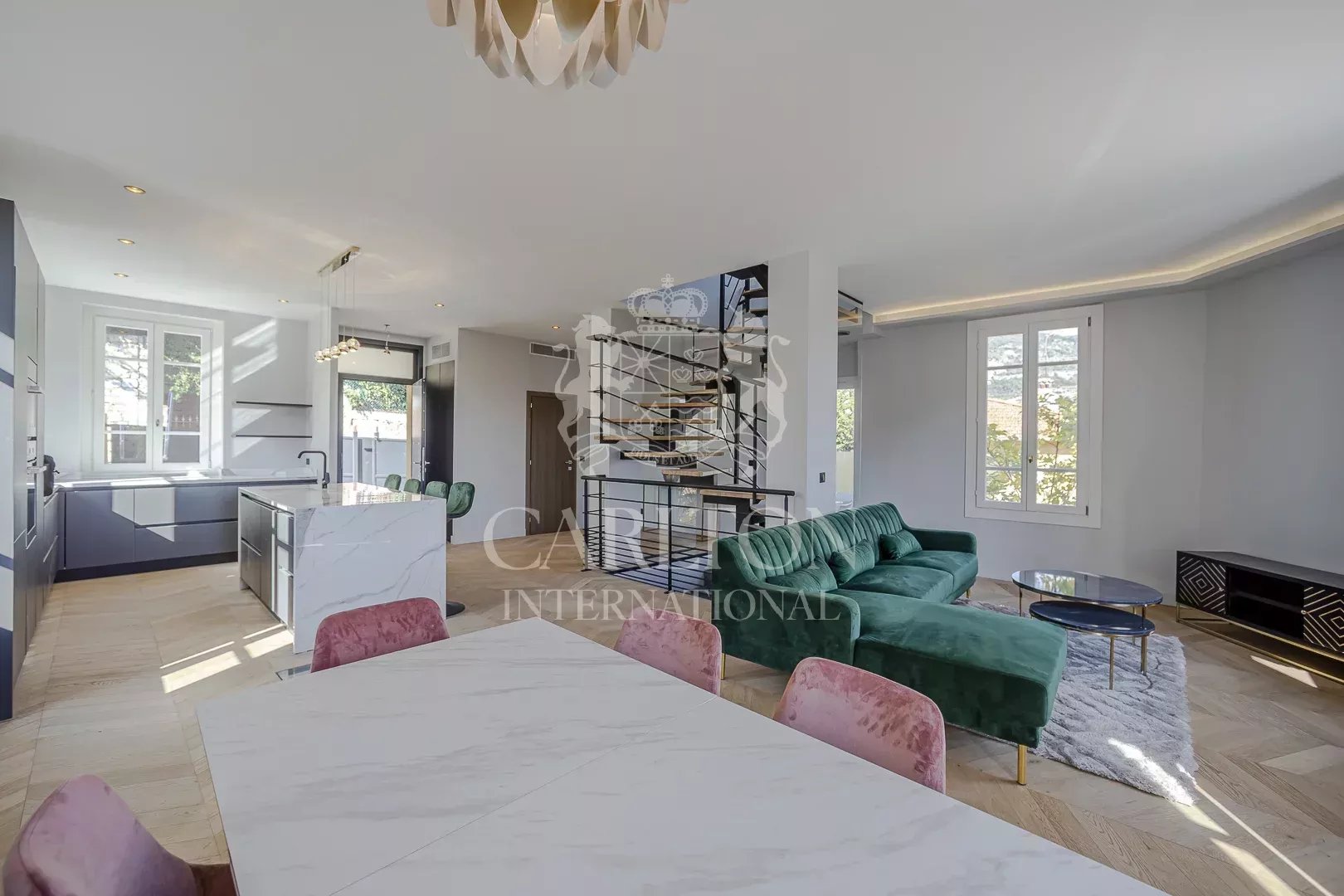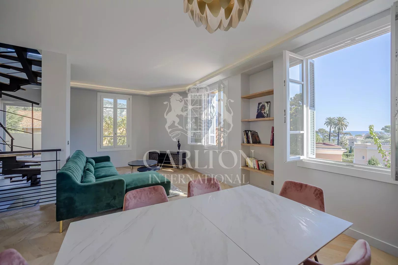 Preciosa villa de unos 225 m2 situada en el centro de Saint Jean Cap Ferrat, a pocos minutos a pie del pueblo, del puerto y de un bonito paseo marítimo. Esta casa de pueblo con aire acondicionado ha sido totalmente renovado a un alto nivel y decorado con gusto y refinamiento en un estilo contemporáneo. El nivel principal consta de una gran sala de recepción con cocina americana equipada, salón, comedor y aseo de invitados.