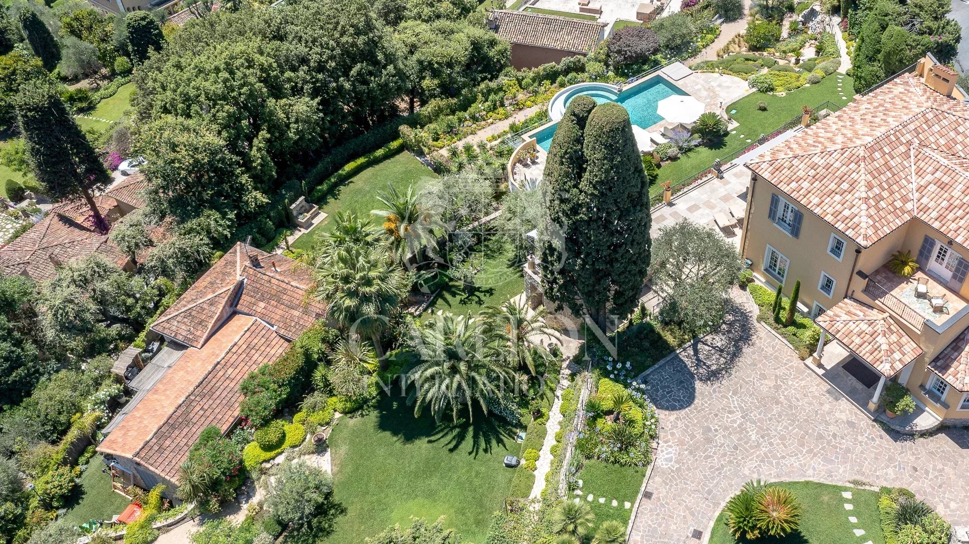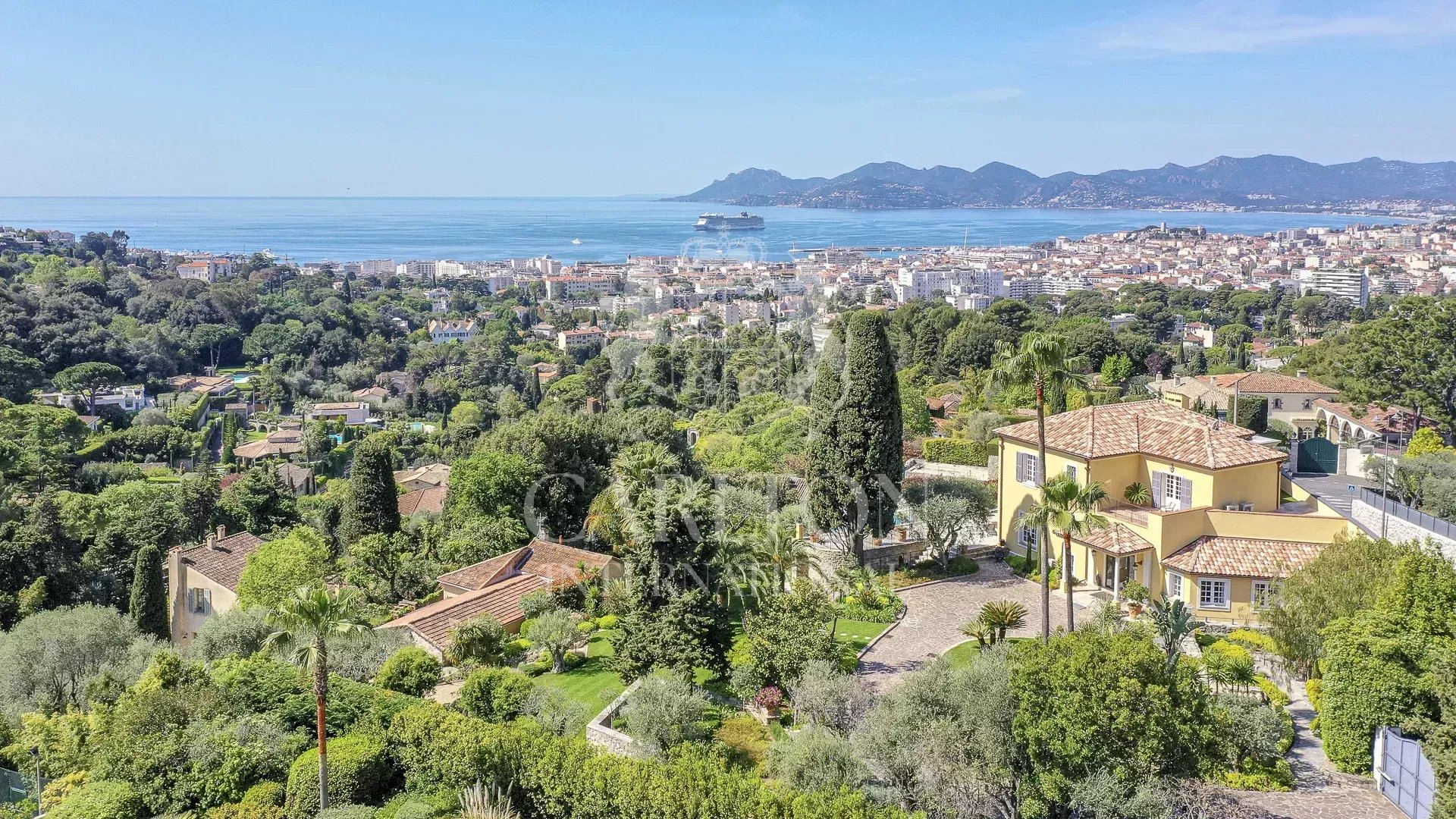 Beautiful Maison de Maître dating from the 1900s, approx. 500m² in a dominant position with panoramic sea views over the Bay of Cannes, set in 4,660 m² of wooded parkland, just a few minutes from downtown. Resident janitor in independent accommodation.
