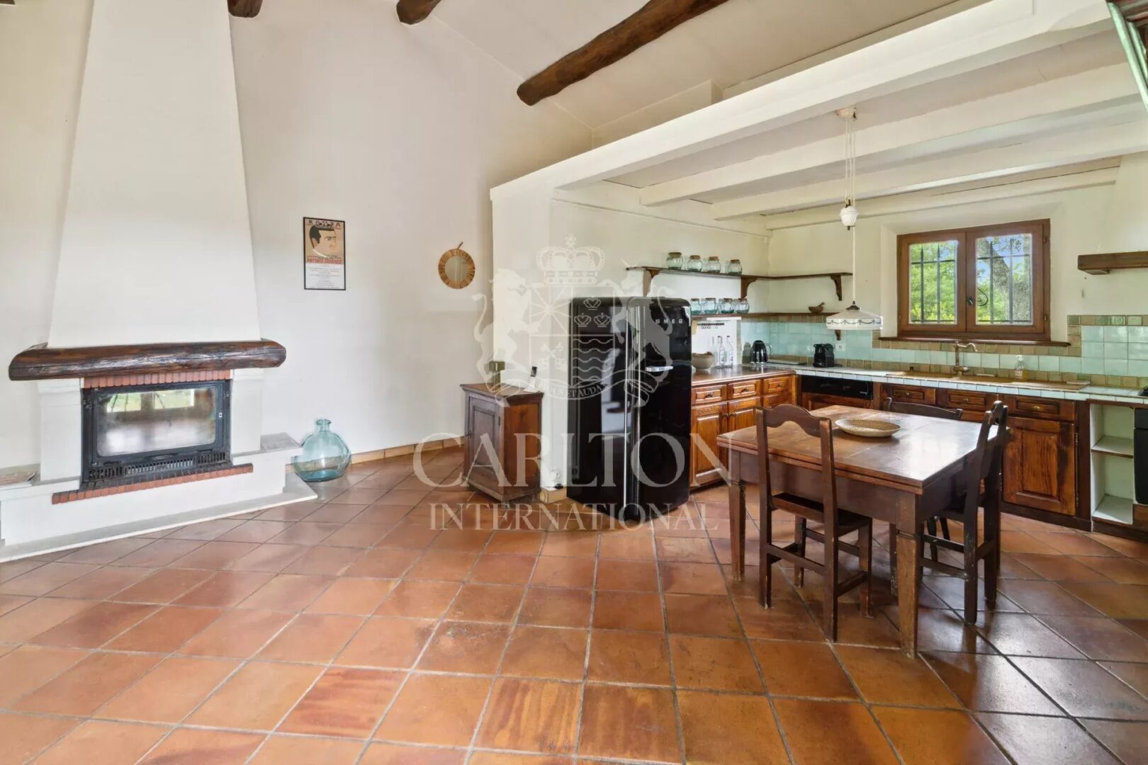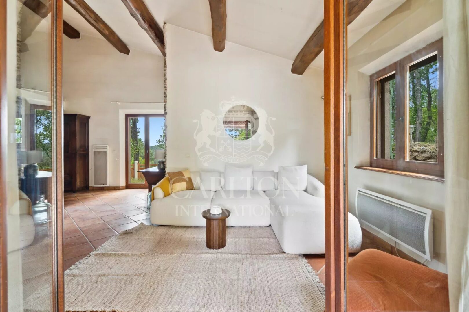 The main house comprises four bedrooms, including an independent guest suite with en-suite shower and toilet. One of the bedrooms is currently used as a walk-in dressing room. The heart of the home is the bright and spacious living area with high ceilings, an open fireplace, a welcoming dining space, and a fully equipped open-plan kitchen. A mezzanine above the kitchen offers additional storage. There is also a guest WC for added convenience. Every room opens onto the inviting pool and terrace area, creating a seamless indoor-outdoor lifestyle and an airy, holiday-inspired atmosphere. A shaded al fresco dining area adjacent to the living room is perfect for entertaining or relaxing during the warm Mediterranean evenings. For creatives and hobbyists, a dedicated workshop is also available. Additional features include an electric gate and ample potential for further personalisation. Whether you’re looking for a tranquil hideaway surrounded by nature or a stylish base in the French Riviera’s glamour, this unique property offers the best of both worlds.