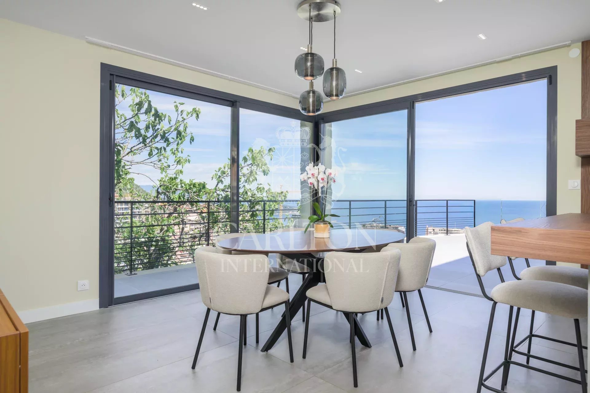 Designed for modern living, the property stands out for its generous volumes, expansive bay windows, multiple terraces, and panoramic views over the Mediterranean Sea.