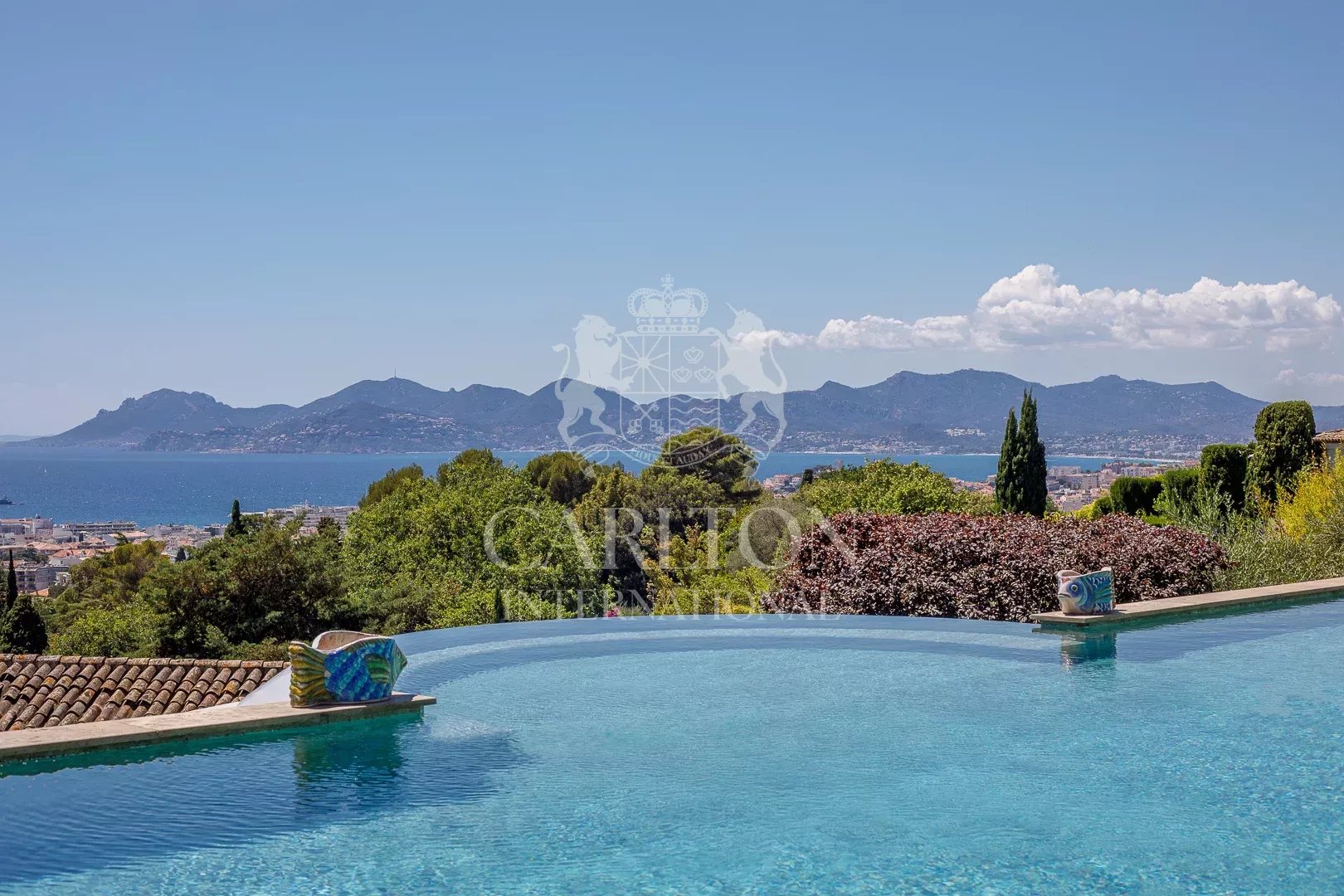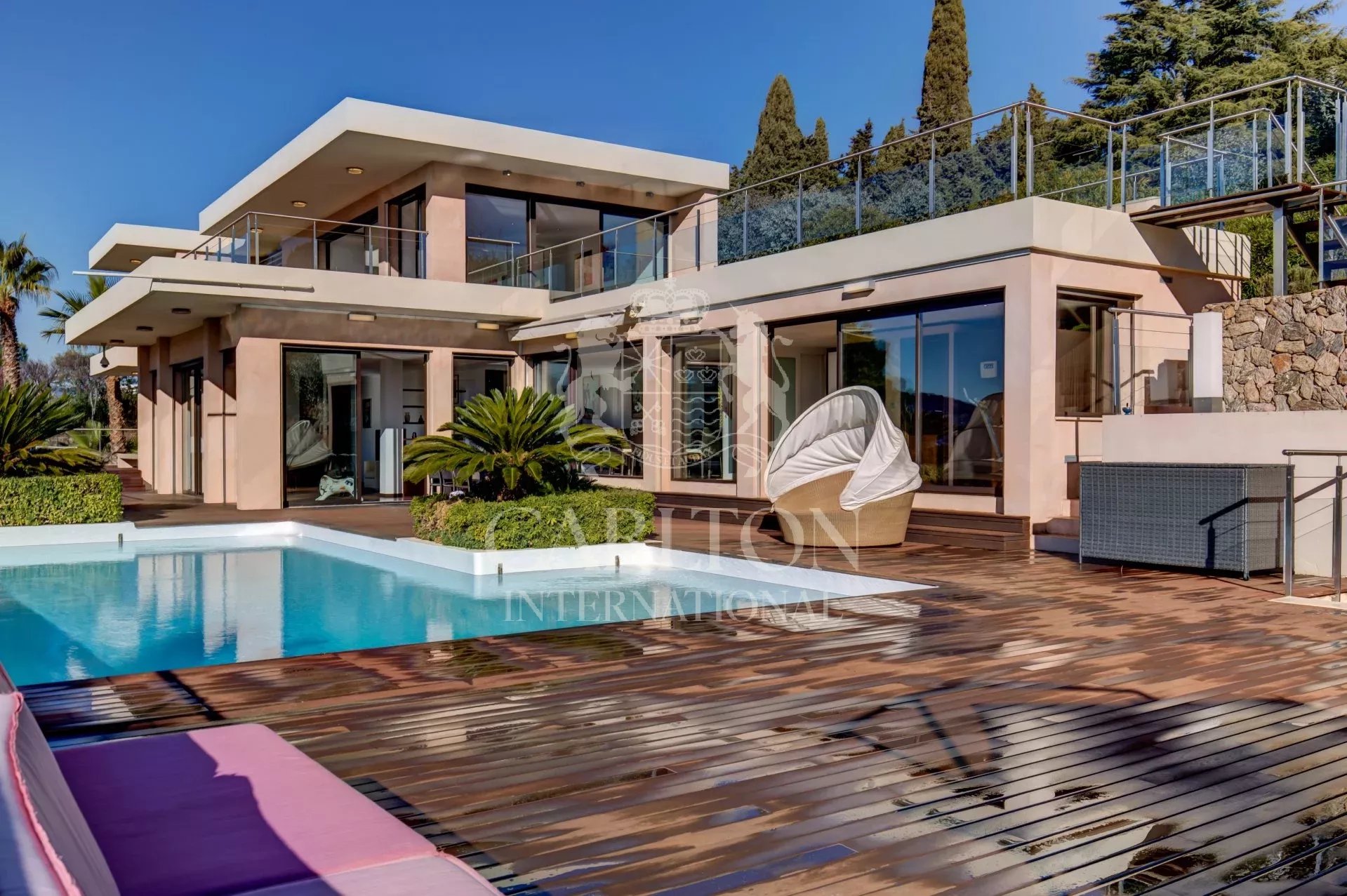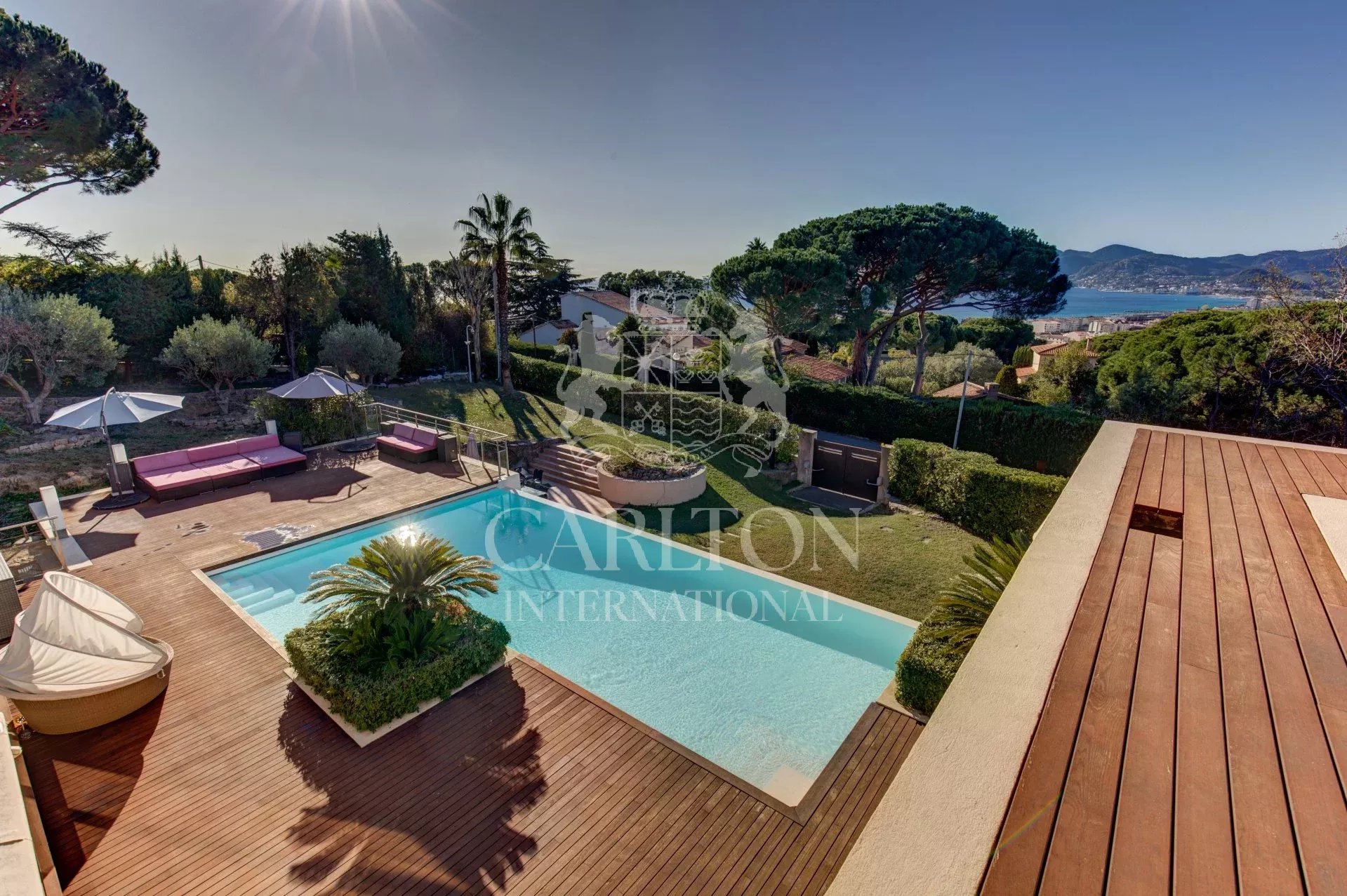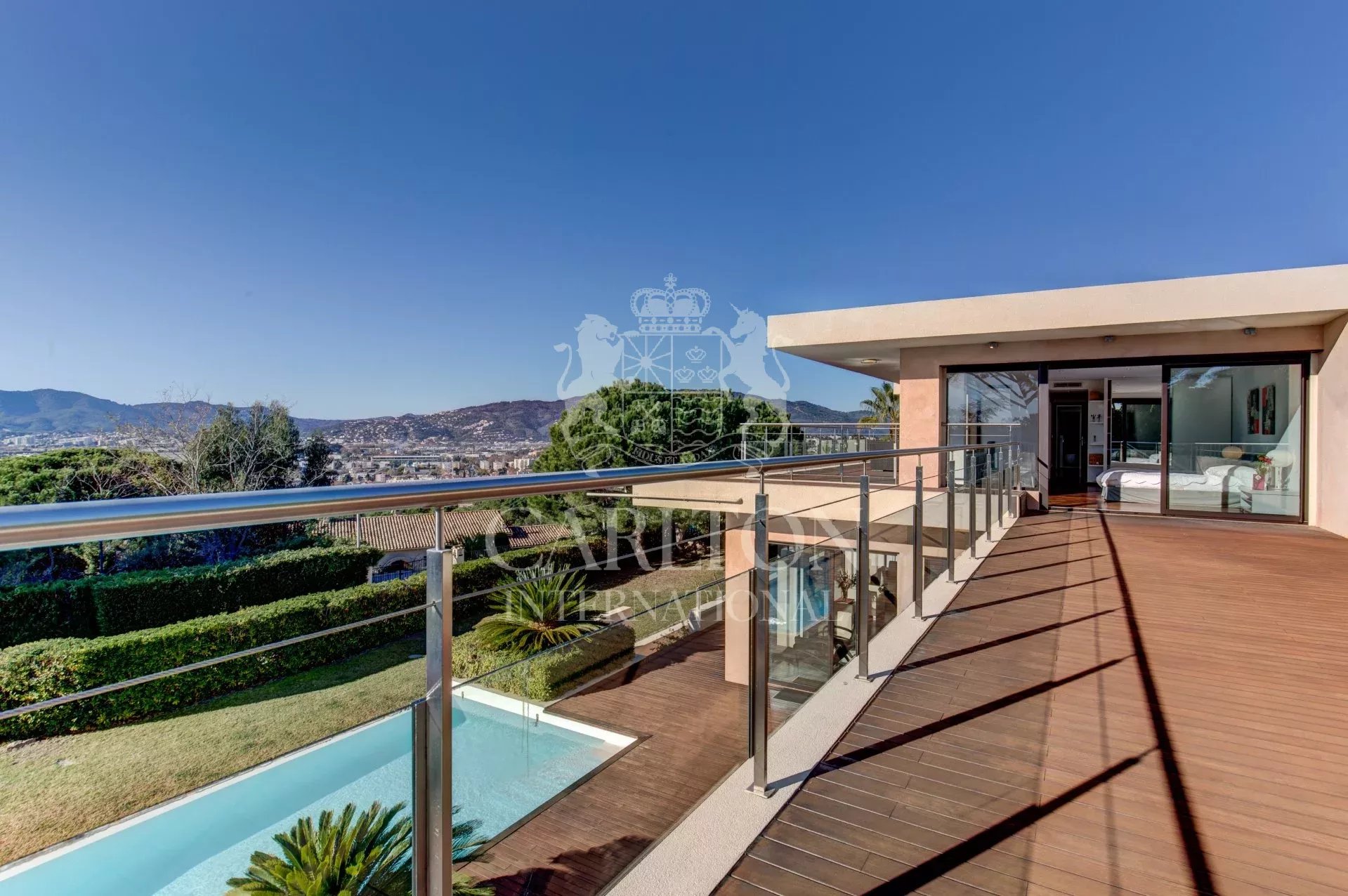 Bonita moradia moderna com cerca de 350 m² situada no bairro de Croix des Gardes, com bonitas vistas para o mar. Totalmente climatizada, esta moradia tem 4 quartos e um escritório que pode ser convertido num quarto com uma casa de banho com duche para até 10 pessoas. As salas de receção abrem-se para a piscina rodeada por um belo terraço e o jardim de 2.500m². O quarto principal de 38m² está situado no primeiro andar e tem um grande terraço privado com vista para o mar. Sala de jogos, sauna, estacionamento.