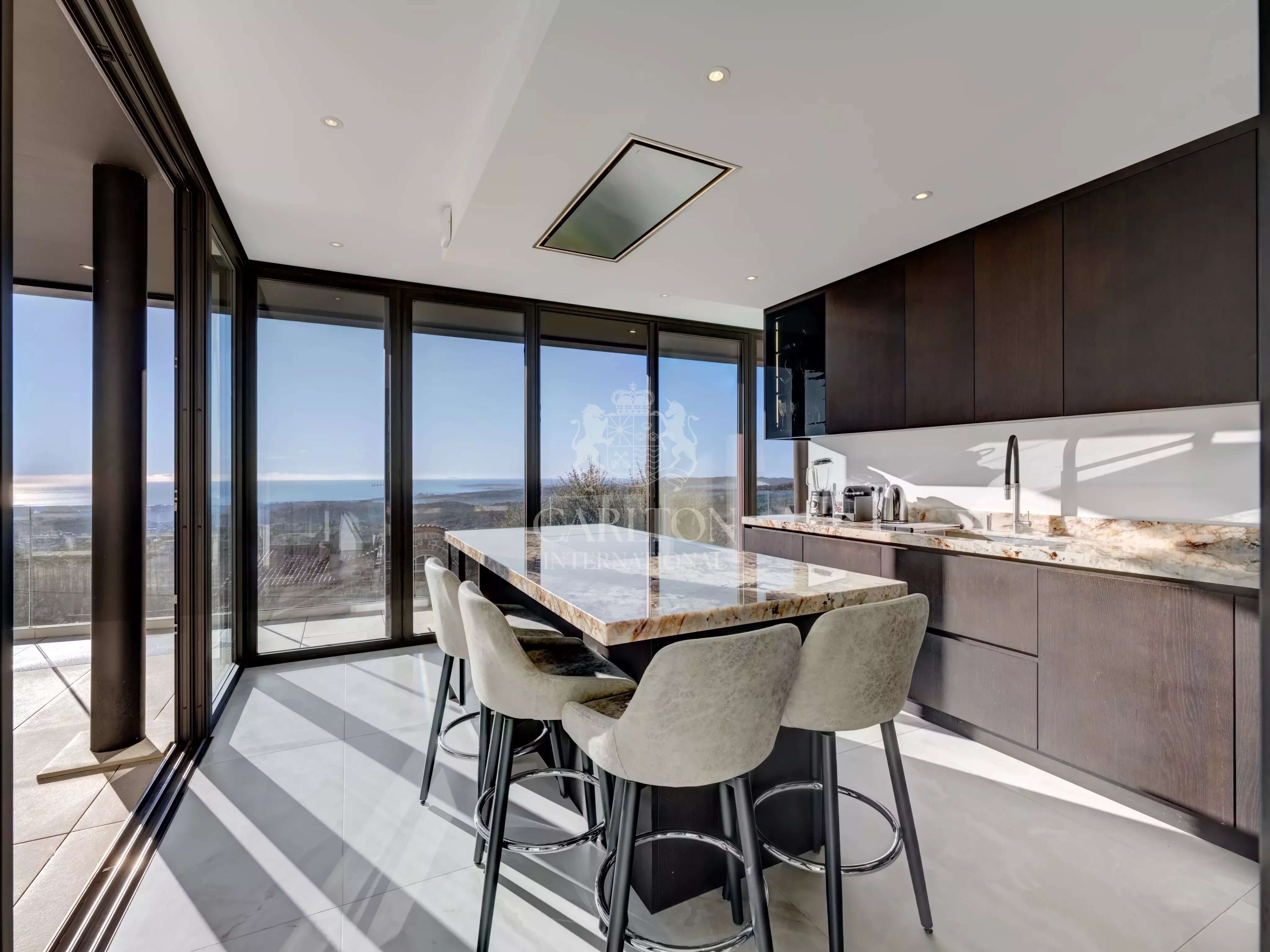 Co-EXCLUSIVE -Rare contemporary villa with pool built in 2023, offering incredible panoramic views of the Mediterranean Sea, Cap d’Antibes, the historic village of Vence and the Estérel massif. The view is present at every glance, from the living room to the dining room, and right through to the elegant, fully-equipped galley kitchen. Ideal exposure from morning to evening to enjoy marvellous sunsets. Ref PIL-00235
