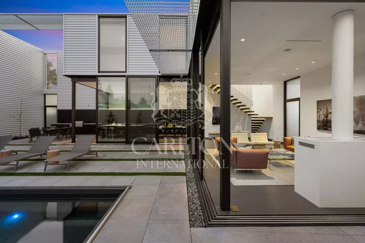 An impeccable, fully-furnished townhouse. It features three bedrooms, two and one-half bathrooms, expansive downstairs living and dining areas, and a secluded swimming pool. Two blocks from downtown Healdsburg’s central Plaza and approximately seventy miles north of San Francisco, the Glass Pavilion sits at the crux of the Russian River Valley, Dry Creek Valley, and Alexander Valley viticultural areas. The property is located within steps of Michelin-starred restaurants and numerous tasting rooms. Sonoma County’s most breathtaking wineries lie a short drive away.