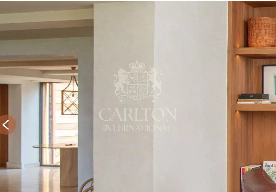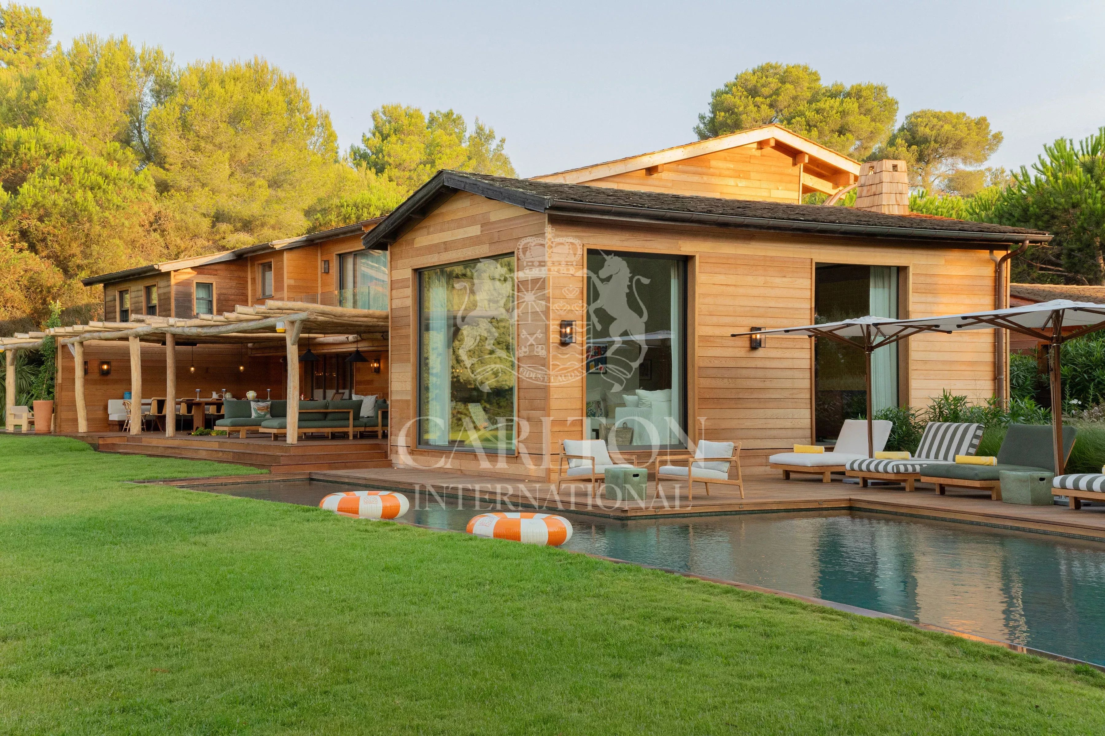 The villa offers five bedrooms, a beautiful living/dining room and a heated outdoor swimming pool in the middle of a pine park. Fitness room and Hammam.