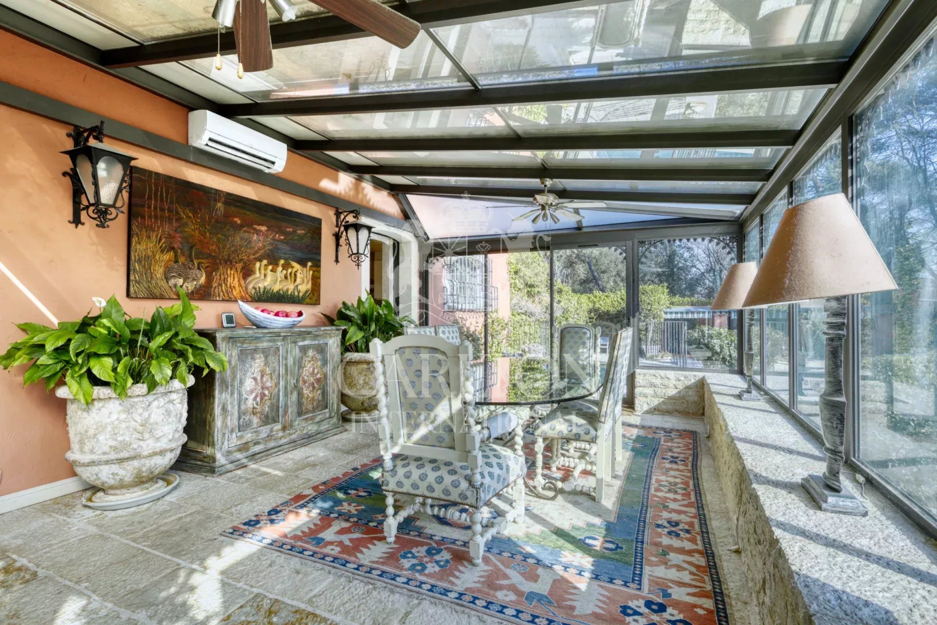 The beautifully landscaped garden of around 5,000 m² features palm trees, century-old olive trees, and Mediterranean plants. A pool, pool house, barbecue area, automatic irrigation, garden lighting, and covered parking for four cars create a seamless and comfortable daily life. Extension potential adds flexibility to this rare opportunity, blending serenity, comfort, and understated elegance. Ref 11336