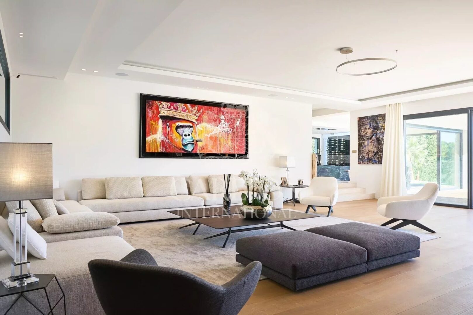 In the heart of one of Mougins’ most sought-after areas, set in a quiet, leafy setting, this magnificent 550 m2 property boasts spacious rooms, a top-of-the-range kitchen with wall-mounted wine cellar, a spacious living room, 5 ensuite bedrooms with dressing rooms and marble bathrooms. There’s also a gym with hammam and sauna, a cinema room, a janitor’s apartment and a large garage.