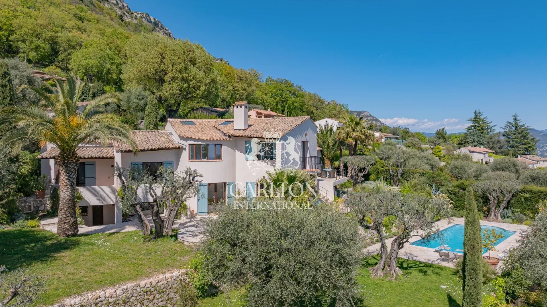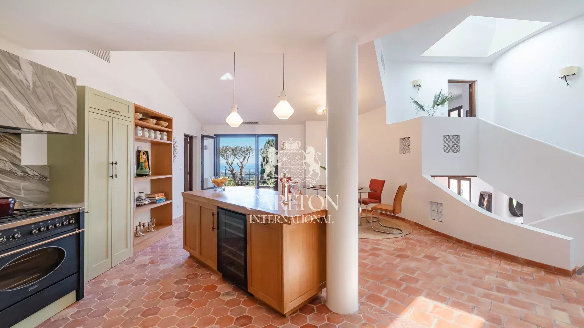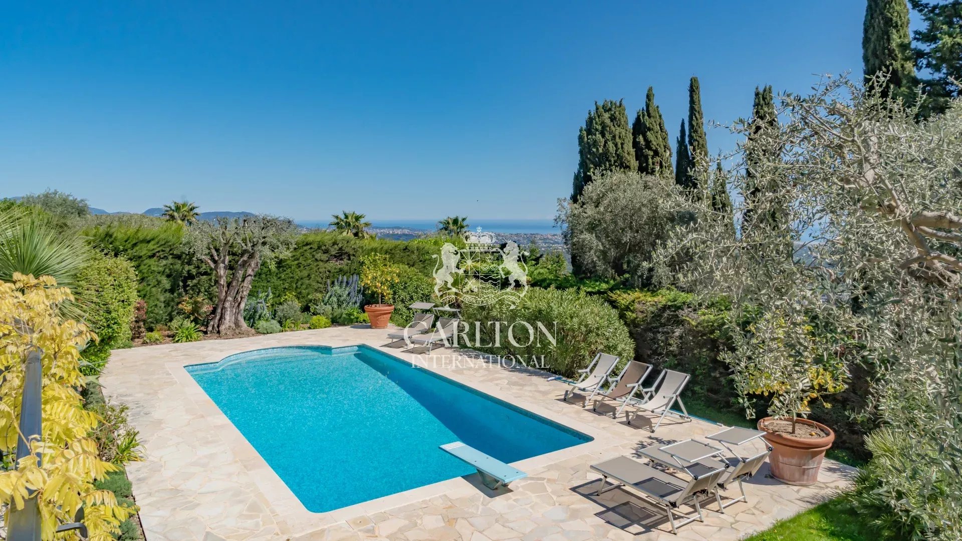 Perched in the hills above Vence, this exceptional property offers a breathtaking panoramic view of the Mediterranean, stretching from Cap Ferrat to Cap d’Antibes.