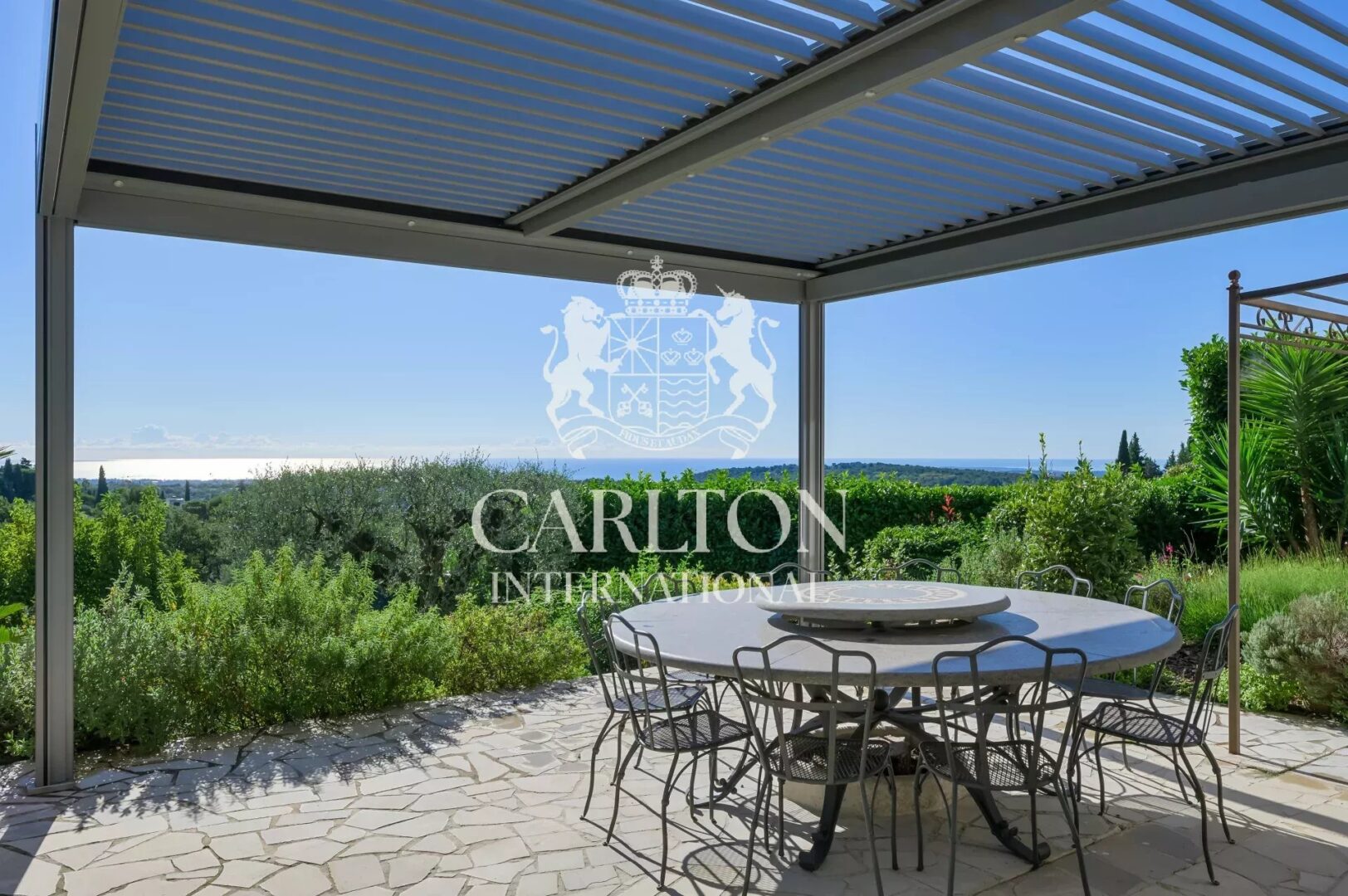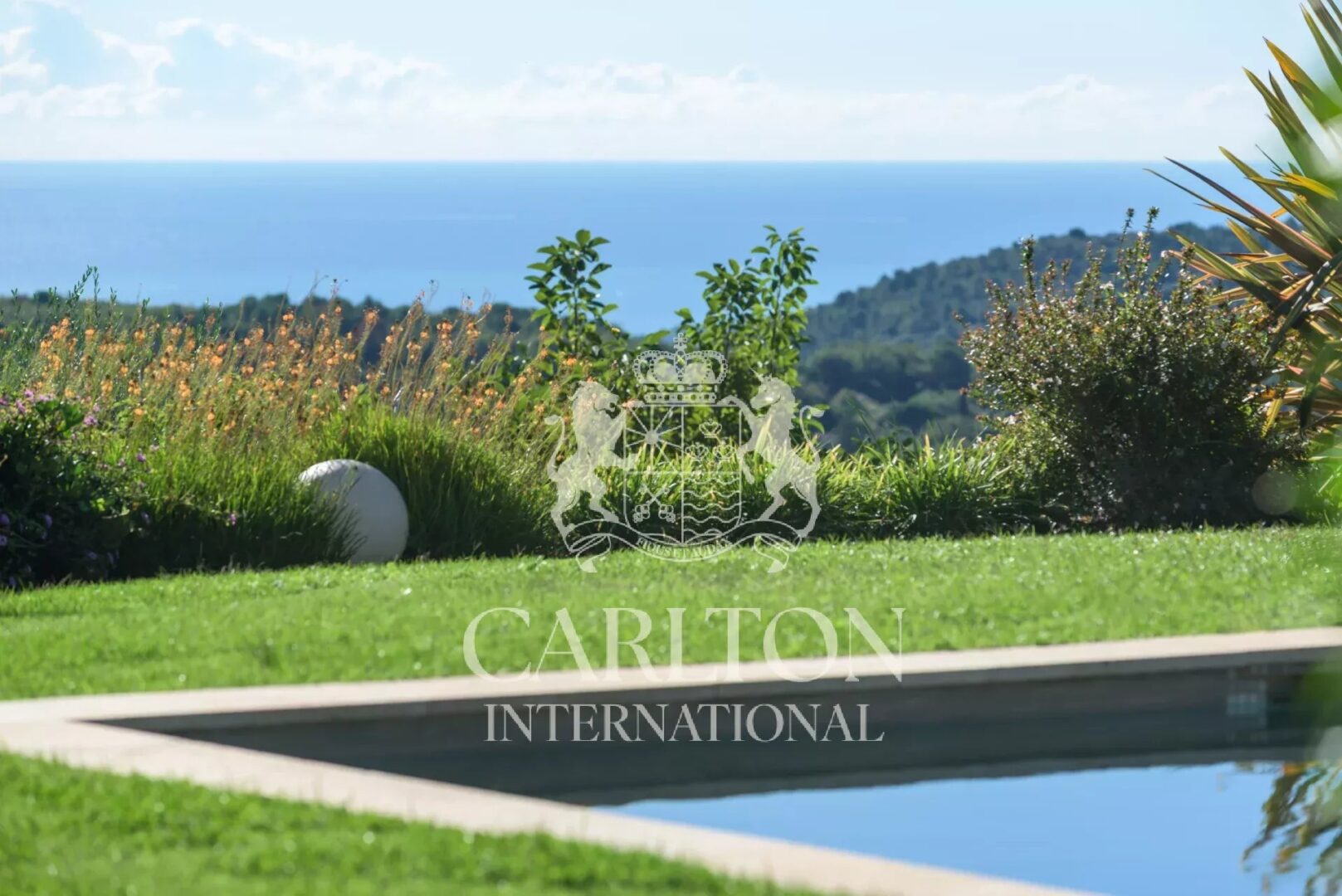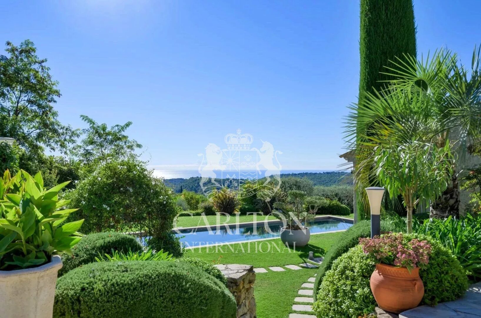 Magnificent villa with a stone façade offering panoramic views of the Mediterranean Sea and the Riviera, featuring a landscaped garden with olive and fruit trees, a heated pool with a jacuzzi, and a pétanque court, ref 00472.