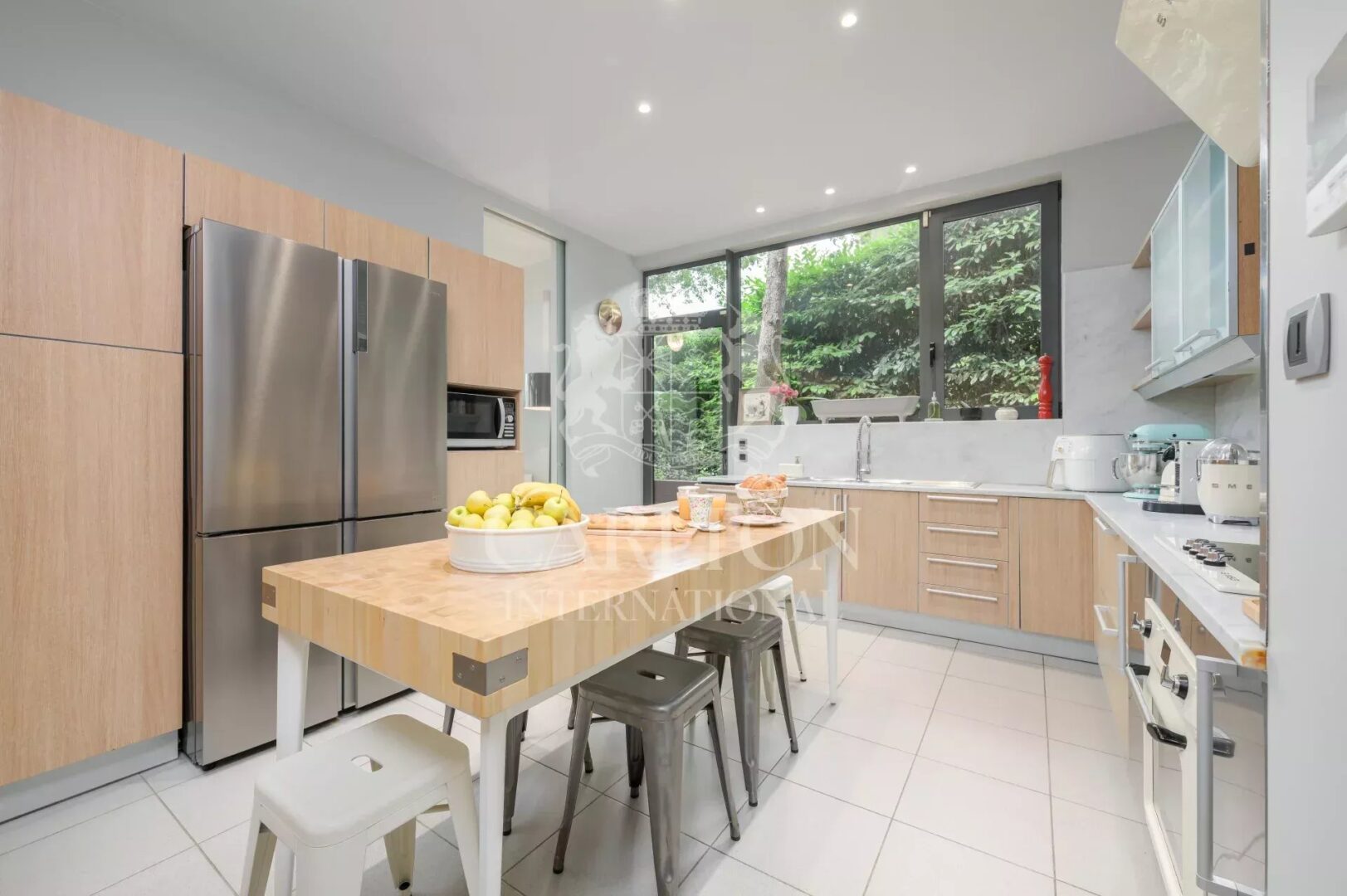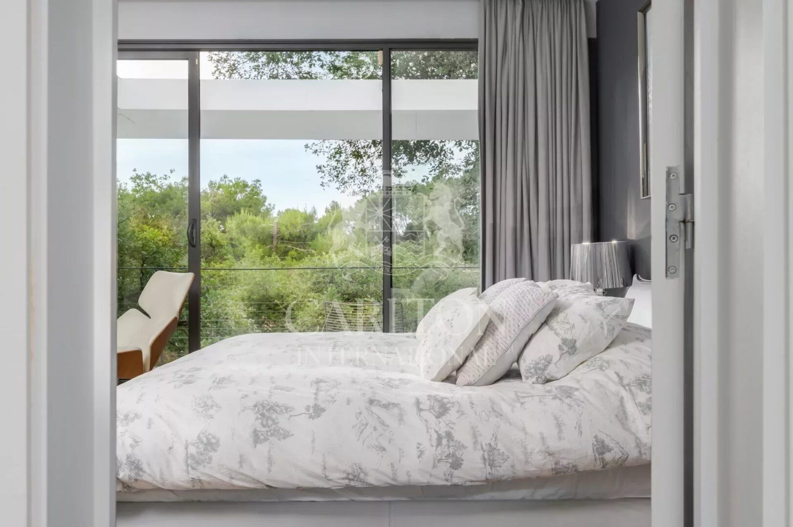 Magnificent 350 m² property with resolutely contemporary lines located in the immediate vicinity of the Maeght Foundation and only a few minutes’ walk from the village of Saint Paul de Vence. Built in 2002 by Italian architect Antonino Cascio, this unique villa remains a benchmark of modern architecture, in part for its innovative bio-climatic features. Accommodating up to 10 guests, the house has 5 air-conditioned double bedrooms. It was completely renovated in 2017 and tastefully furnished, combining elegance and modern design. In perfect harmony with its surroundings, this villa is nestled in the heart of a 2,700 m² garden with magnificent oak and pine trees, beautiful landscaped terraces and a saltwater swimming pool that can be heated. This property benefits from optimal sunshine; flooded with light, it ensures calm, serenity and discretion. A unique creation “coup de coeur” for authentic lovers of nature, design and modern art. Ref 828