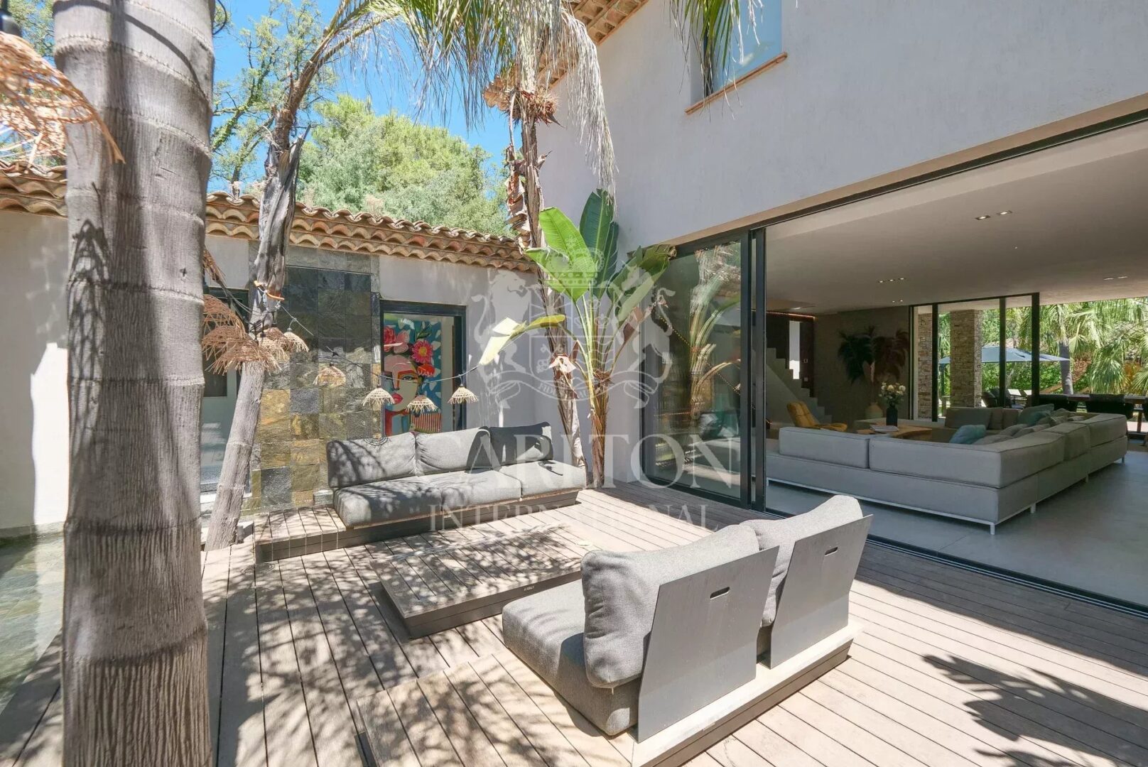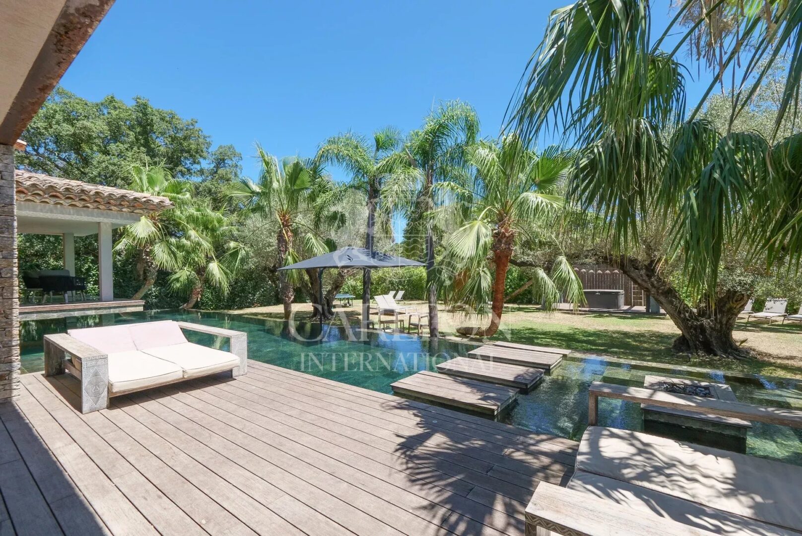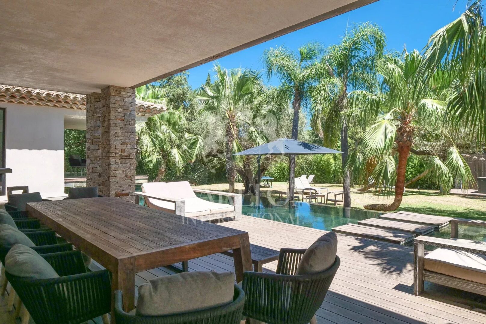 The palm-tree-planted garden, natural materials and light-filled volumes give this property a chic, exotic lifestyle, just a few minutes from the center of Saint-Tropez.