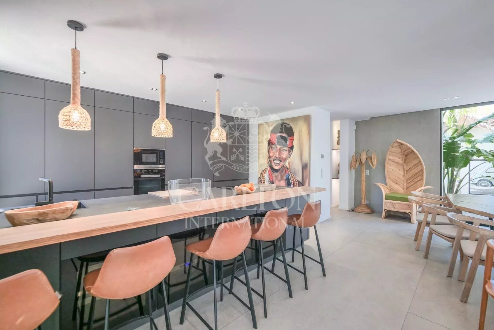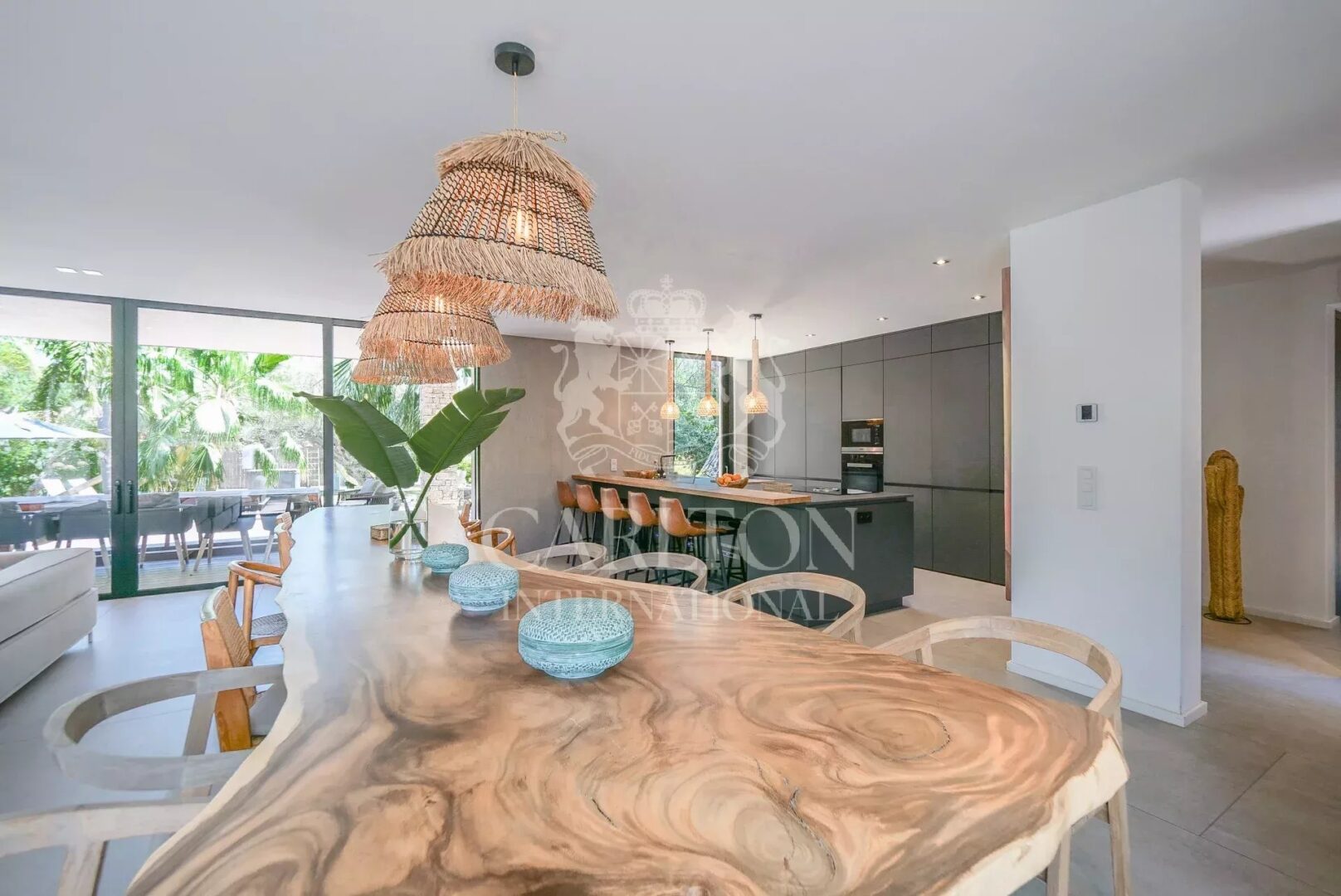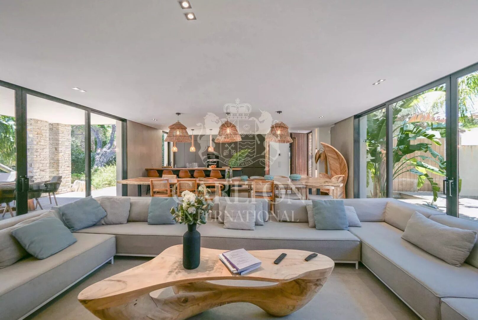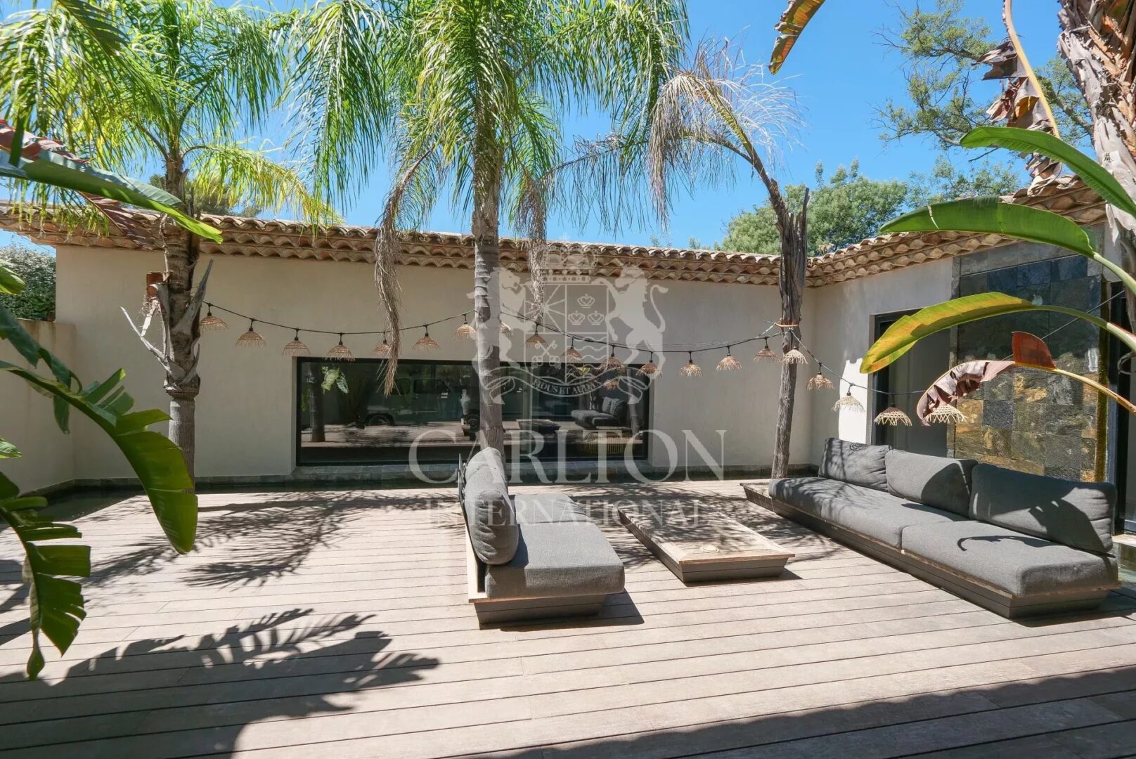 The palm-tree-planted garden, natural materials and light-filled volumes give this property a chic, exotic lifestyle, just a few minutes from the center of Saint-Tropez.