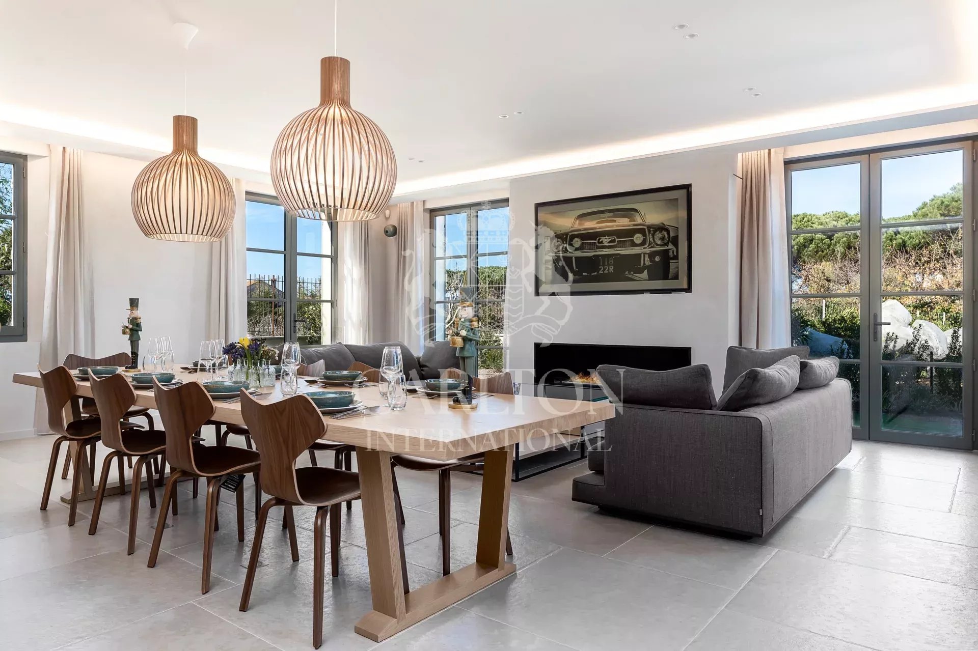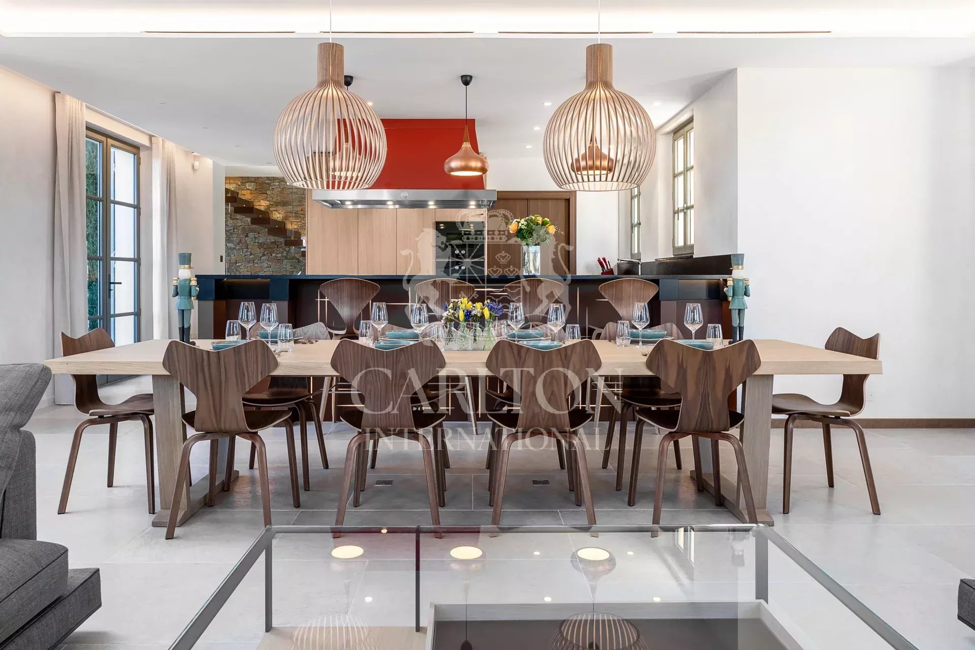 Spacious entrance hall, fully equipped kitchen with its superb La Cornue worktop, friendly bar and wine cellar (filled daily), all opening onto a comfortable living room with an ethanol fireplace and a large dining table can accommodate 14 people.